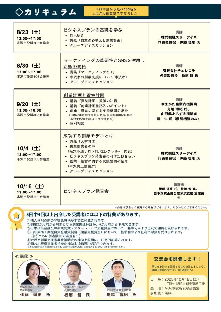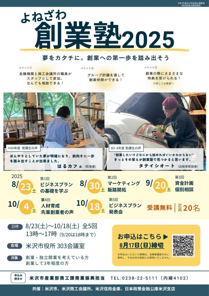 米沢市が主催する令和7年度の『よねざわ創業塾2025』において、第2日目に『マーケティングの重要性とSNSを活用した販路開拓』をテーマに講義を行いました。また、第5日目の『ビジネスプラン発表会』では講評者を務めました。